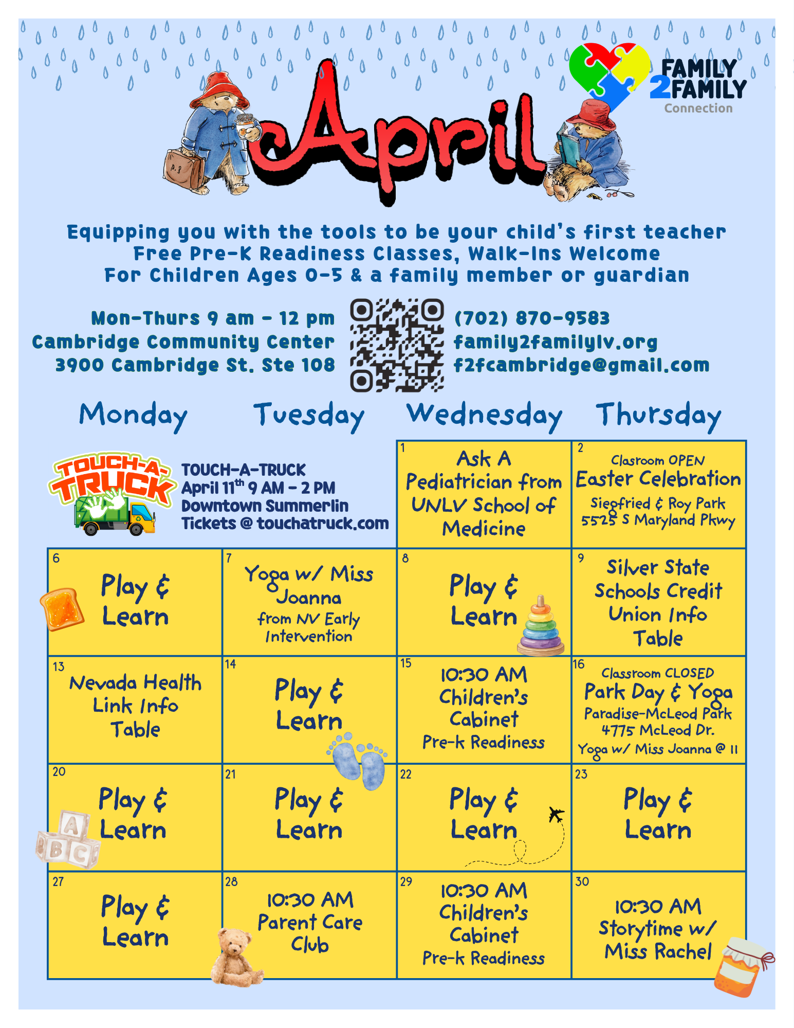 Calendar & First Day First Day Info + Paperwork Walk-ins welcome, but families are encouraged to print & fill out paperwork before their first class. Demographics Form EnglishEspañol Rules - Signature Needed EnglishEspañol Safety Waiver - Signature Needed EnglishEspañol Suggested Vaccines EnglishEspañol Milestones Checklist EnglishEspañol Explore the Center View fullsize Meet Our Staff Read Our Story
