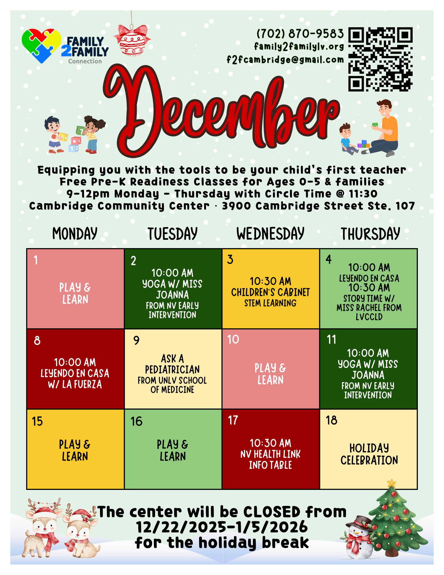 Calendar & First Day First Day Info + Paperwork Walk-ins welcome, but families are encouraged to print & fill out paperwork before their first class. Demographics Form EnglishEspañol Rules - Signature Needed EnglishEspañol Safety Waiver - Signature Needed EnglishEspañol Suggested Vaccines EnglishEspañol Milestones Checklist EnglishEspañol Explore the Center Meet Our Staff Read Our Story